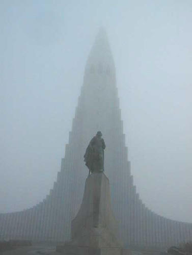 A Foggy Day, Leif Eriksson in front of Hallgrimskirkja, Reykjavik Iceland Oct. 2001 |